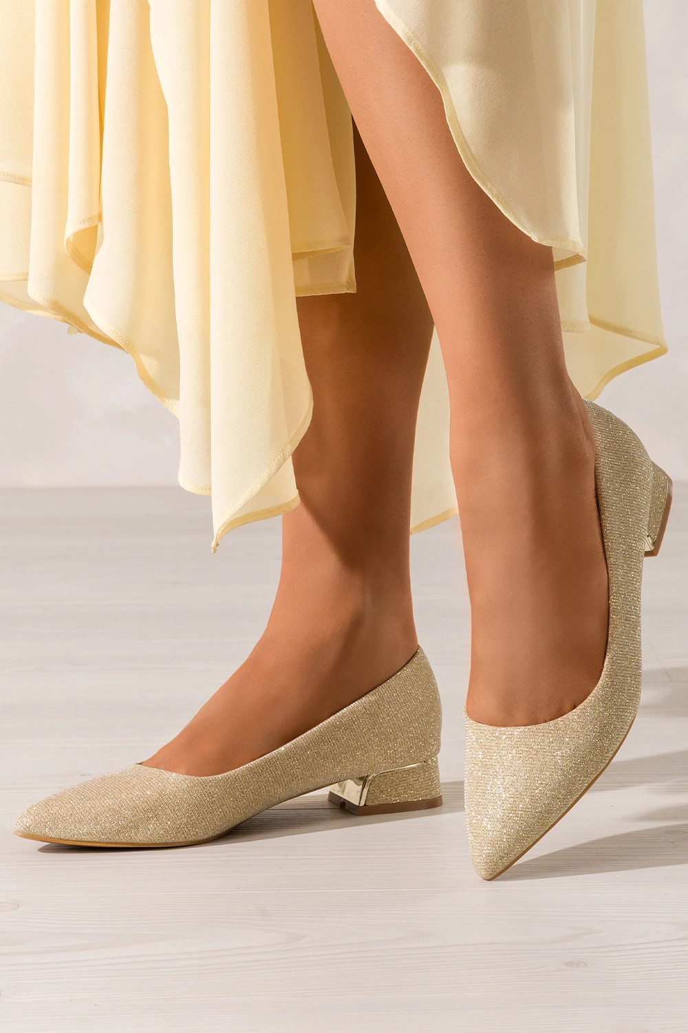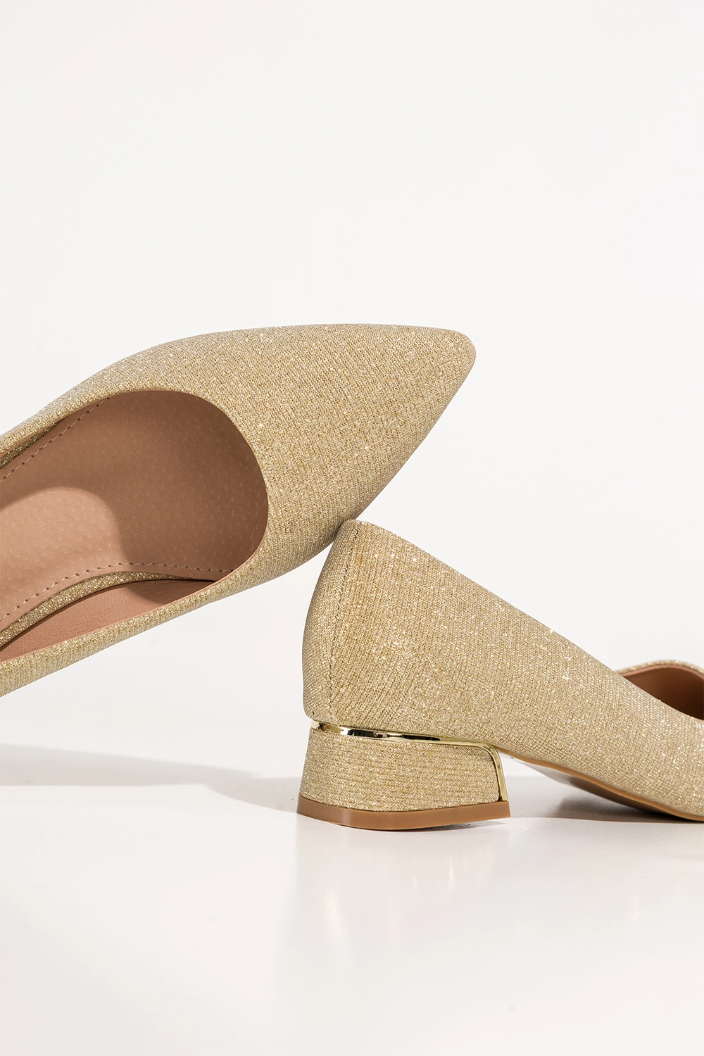 Złote baleriny damskie brokatowe na ozdobnym niskim obcasie skórzana wkładka Carla model M530P to propozycja, która zachwyca już od pierwszego spojrzenia. Ta wyjątkowa para obuwia to nie tylko elegancja i styl, ale przede wszystkim komfort i jakość wykonania, które czyni je idealnym wyborem na każdą okazję. Model łączy w sobie subtelną kobiecość, nowoczesny design oraz niezawodną wygodę, dzięki czemu zyskuje uznanie kobiet ceniących modę, ale niechcących rezygnować z funkcjonalności. Wyjątkowy złoty kolor oraz brokatowa cholewka sprawiają, że buty te przyciągają wzrok i stają się kluczowym elementem każdej stylizacji.