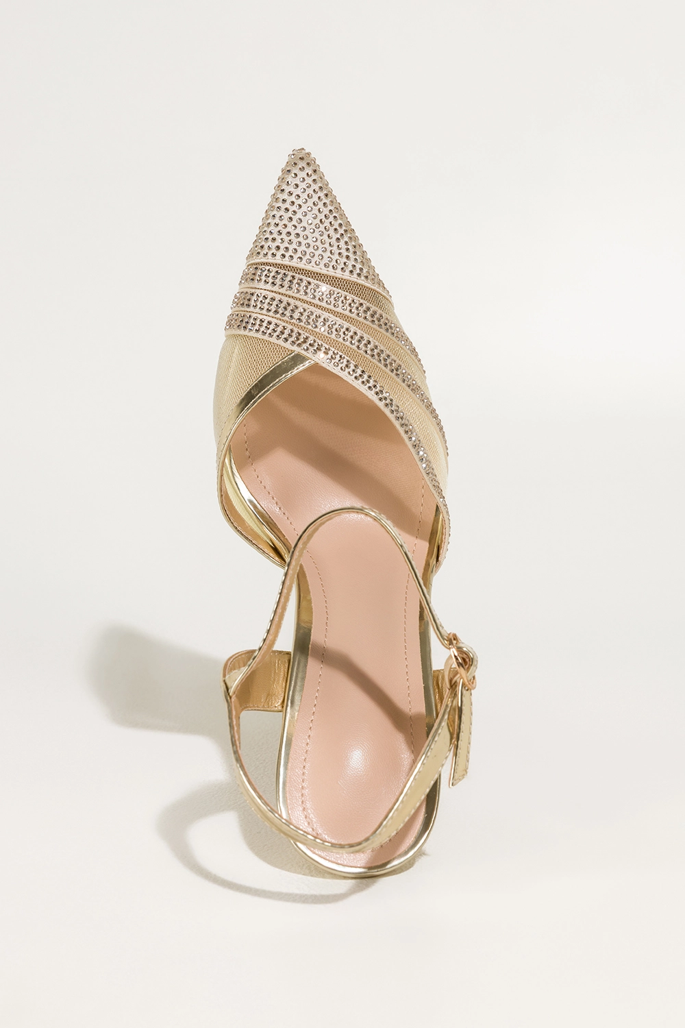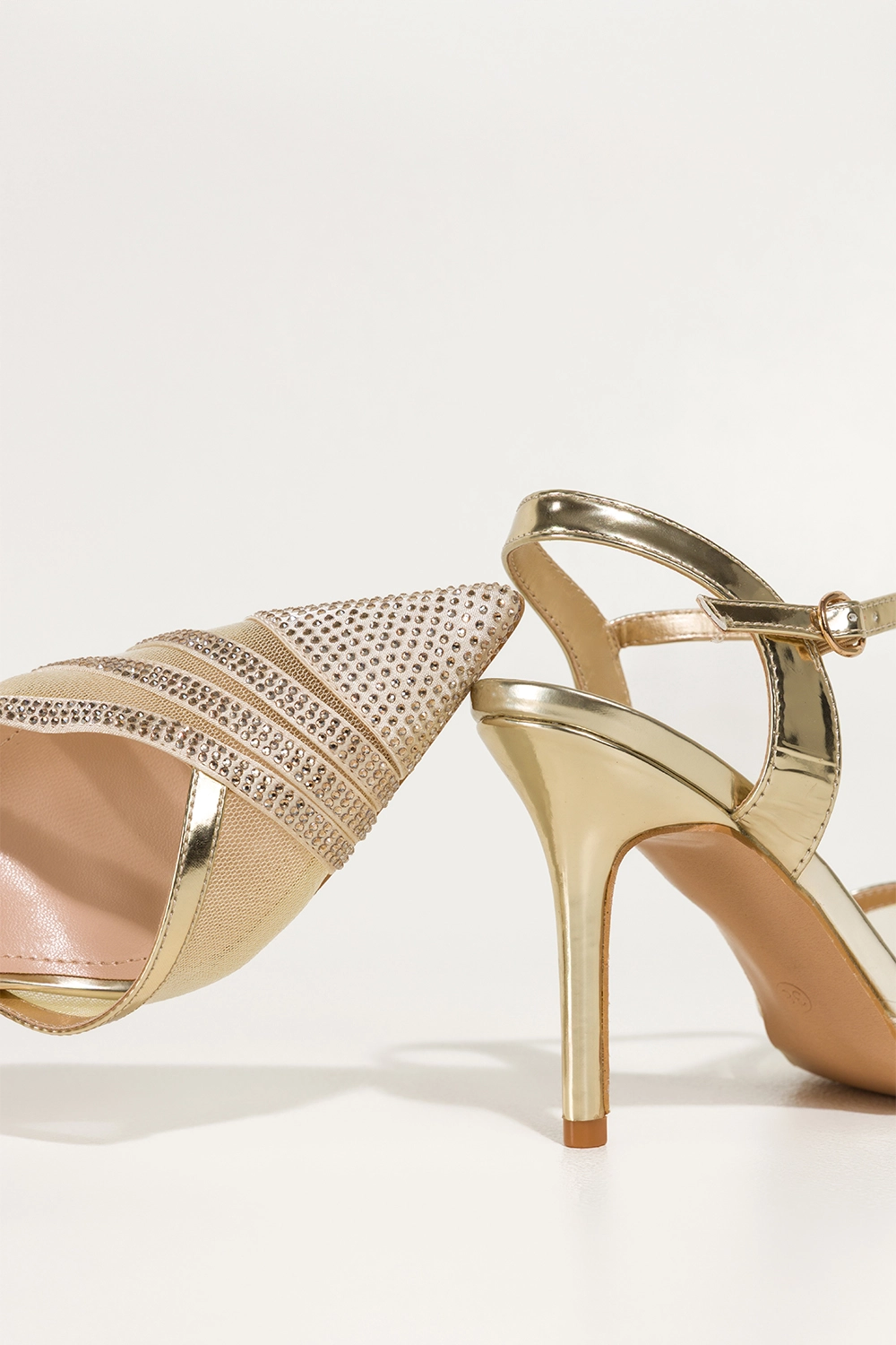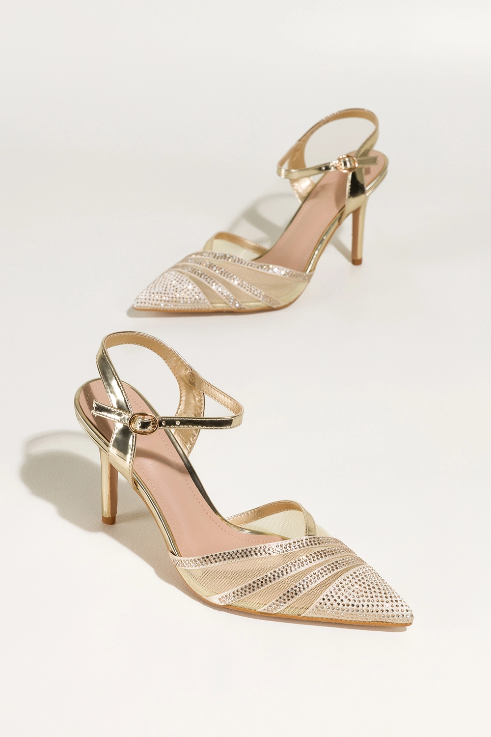 Cholewka ozdobiona delikatną, transparentną siateczką pokrytą błyszczącymi cyrkoniami to prawdziwa perełka w świecie eleganckiego obuwia. Cyrkonie pięknie łapią światło, tworząc hipnotyzujący efekt przy każdym kroku. Odkryta pięta i złoty pasek z klamerką nie tylko dodają zmysłowości, ale również zapewniają stabilność i odpowiednie dopasowanie do stopy. To obuwie, które podkreśli każdą stylizację, od balowej sukni, przez koktajlową kreację, aż po eleganckie garniturowe spodnie.