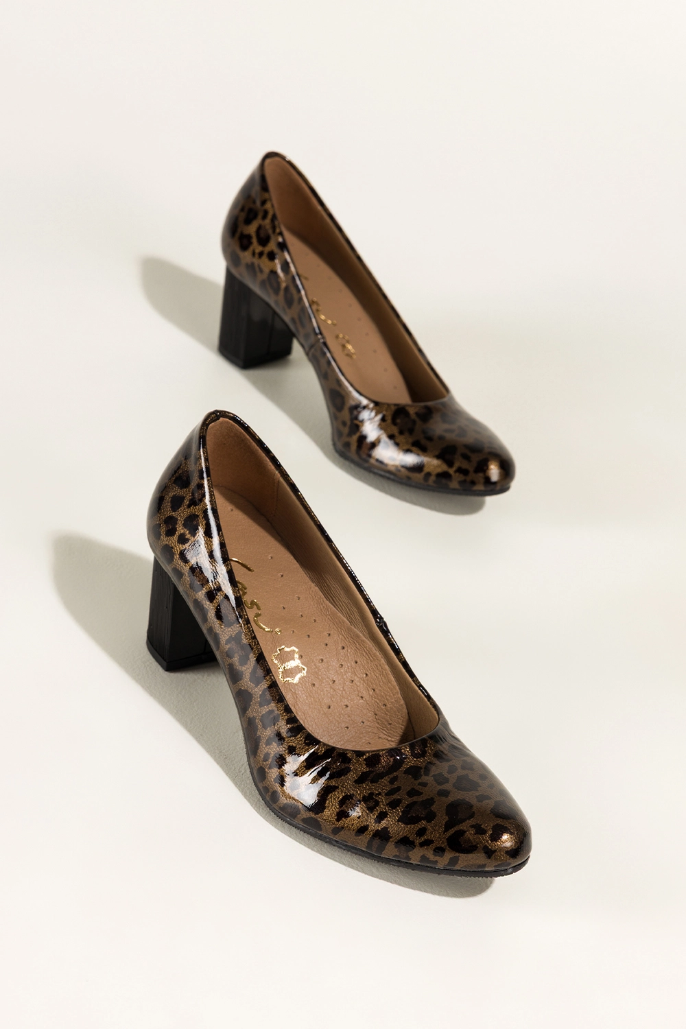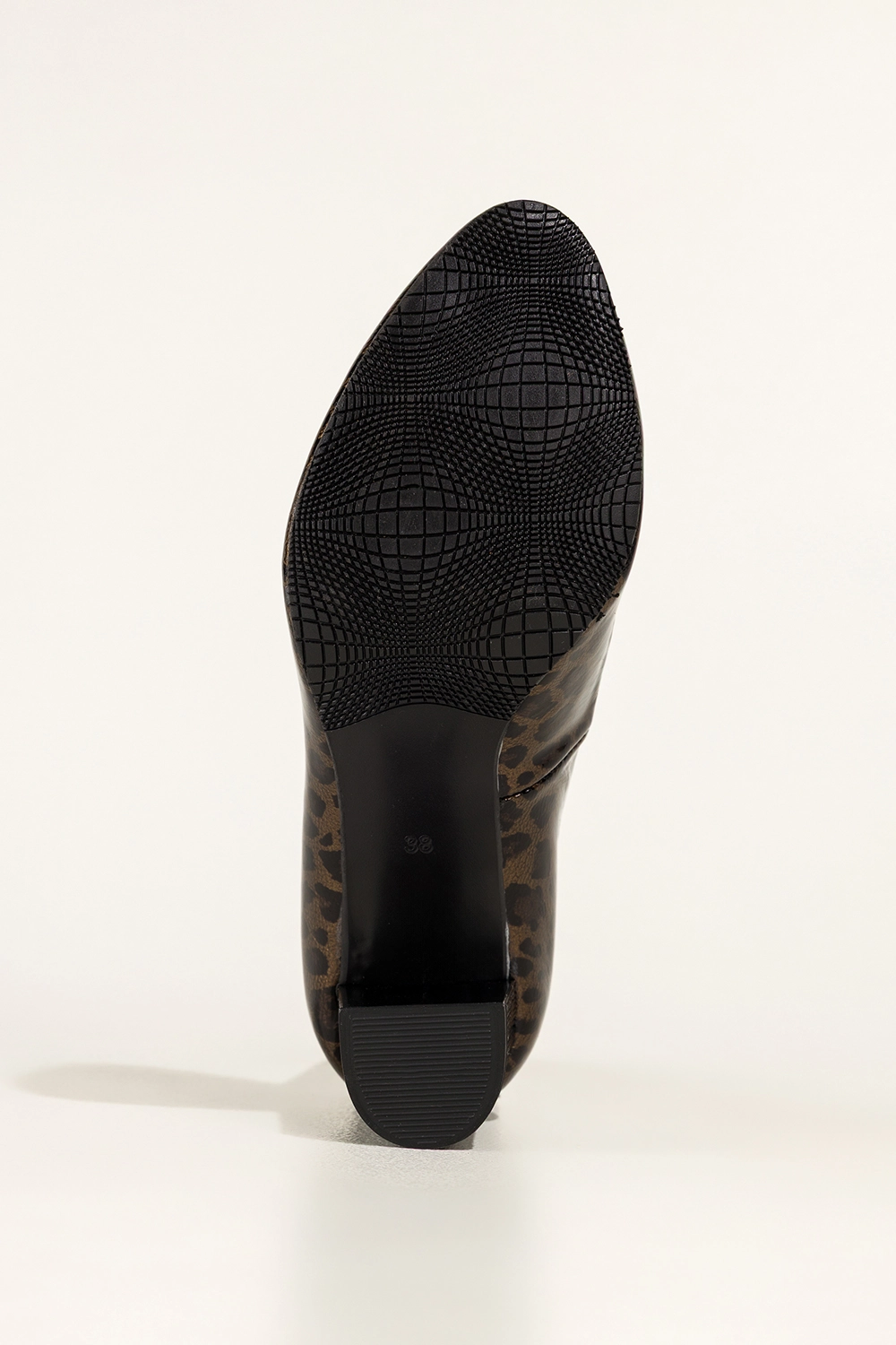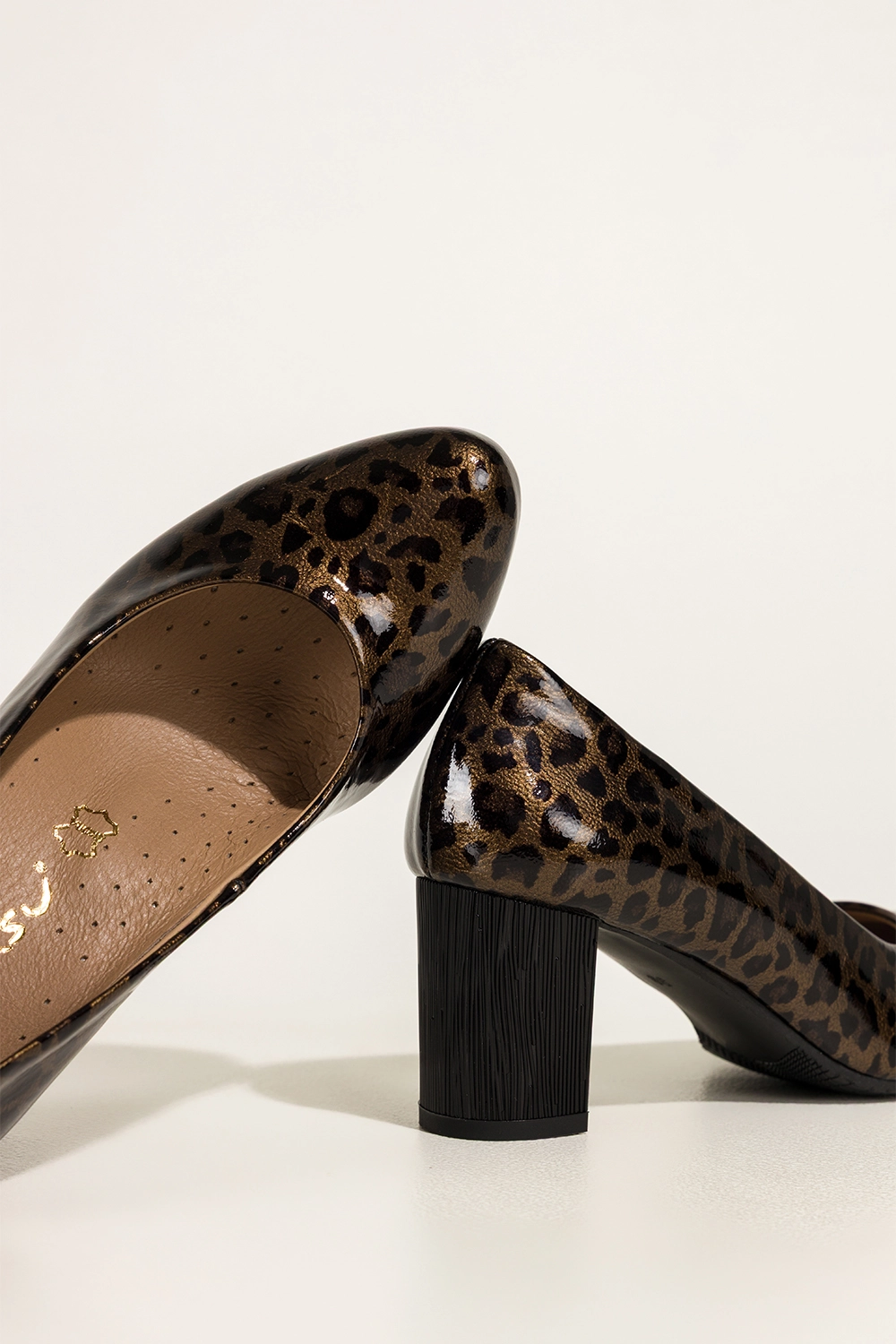 Oryginalny wzór panterki na cholewce nadaje im drapieżnego charakteru, idealnie przełamując klasyczną formę. Ozdobny, czarny słupek nie tylko stabilizuje krok, ale też dodaje wyrafinowanego kontrastu. Zaokrąglony nosek i lakierowana skóra sprawiają, że te buty są świetnym wyborem zarówno na eleganckie wyjścia, jak i odważne stylizacje casualowe.