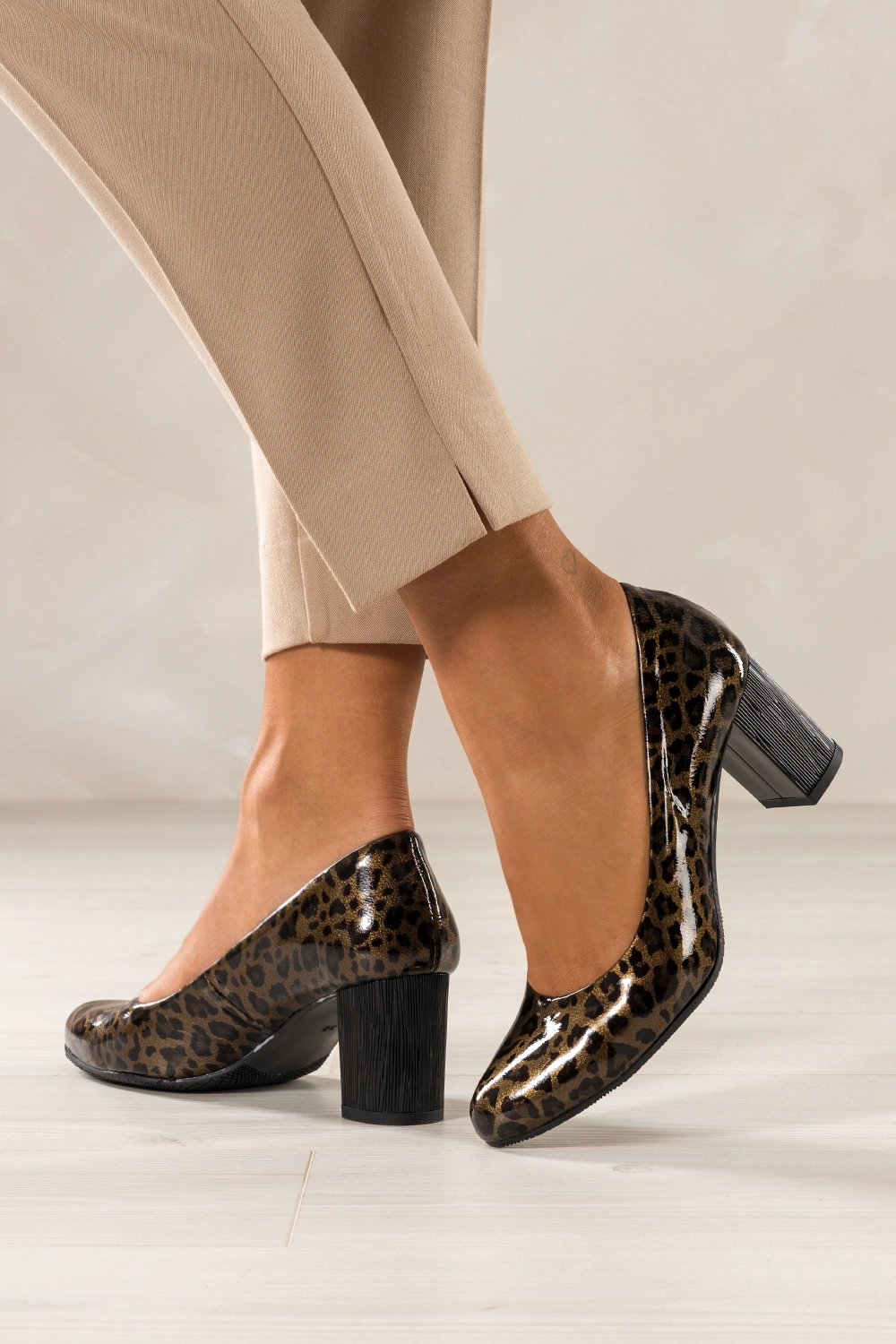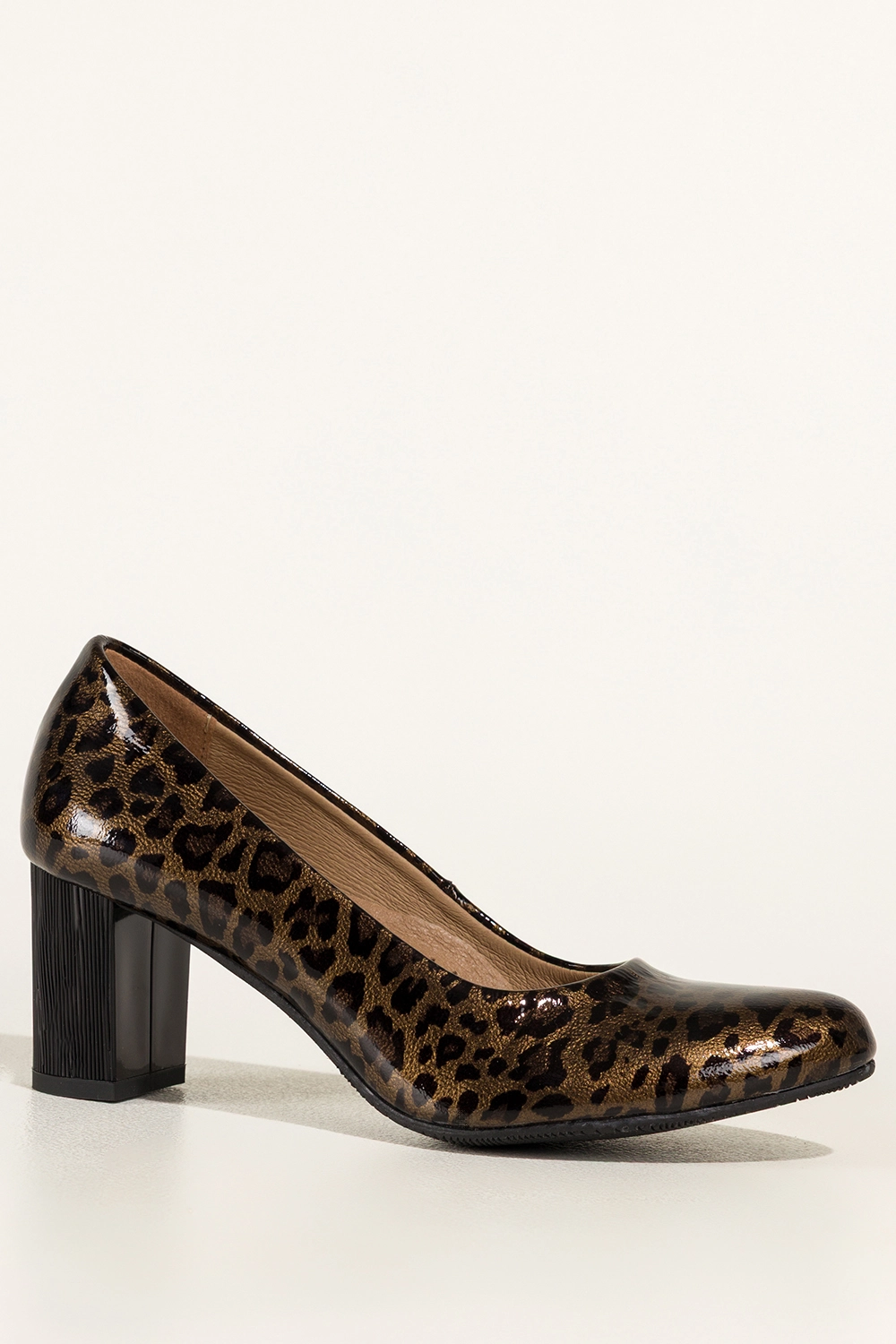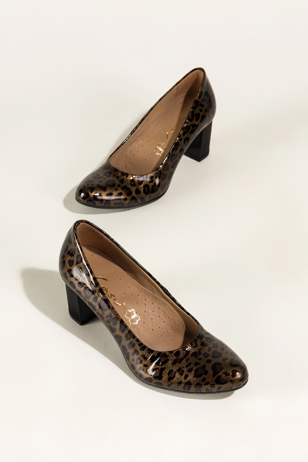 Oryginalny wzór panterki na cholewce nadaje im drapieżnego charakteru, idealnie przełamując klasyczną formę. Ozdobny, czarny słupek nie tylko stabilizuje krok, ale też dodaje wyrafinowanego kontrastu. Zaokrąglony nosek i lakierowana skóra sprawiają, że te buty są świetnym wyborem zarówno na eleganckie wyjścia, jak i odważne stylizacje casualowe.