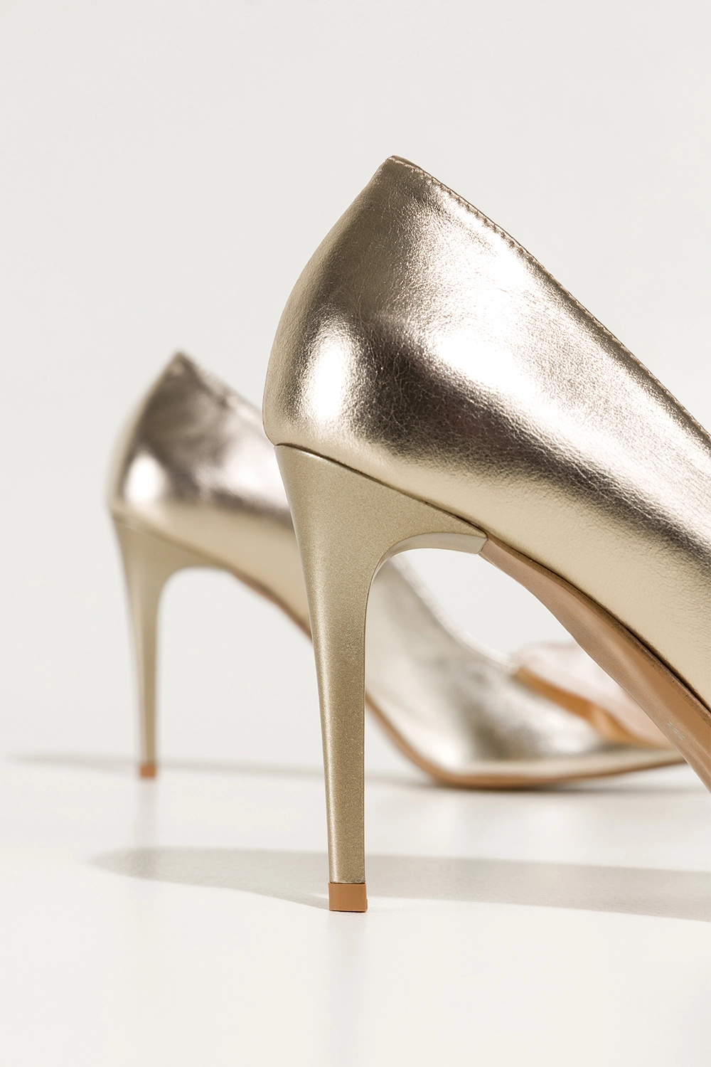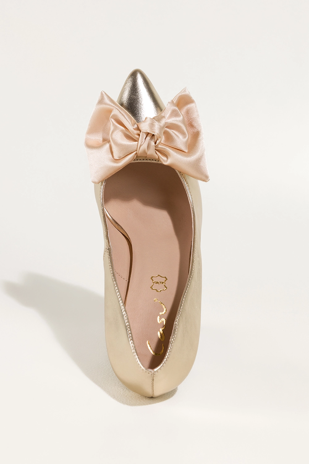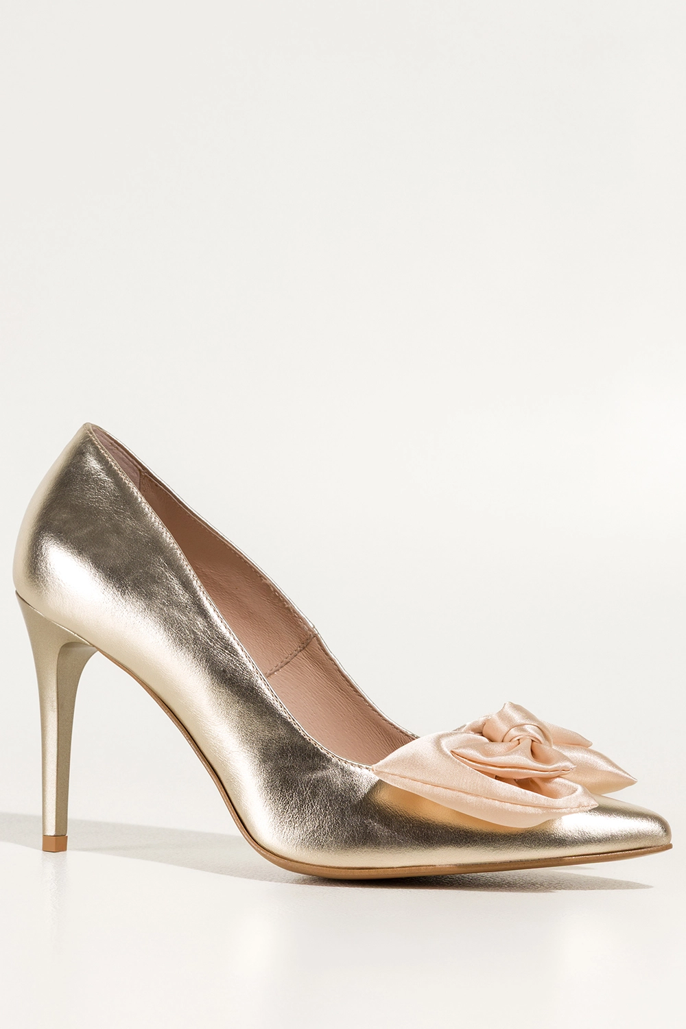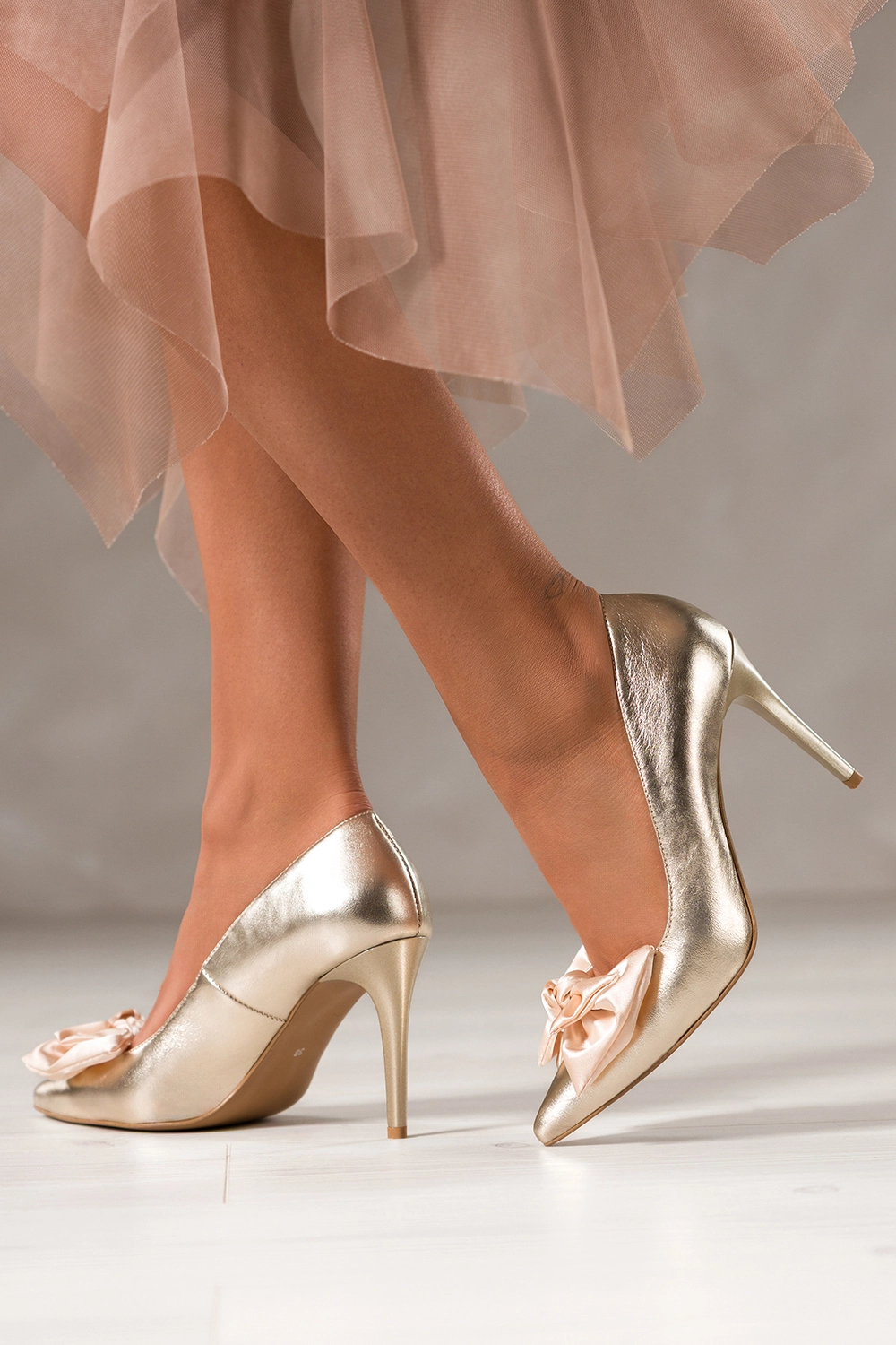 Złote czółenka skórzane damskie szpilki z satynową beżową kokardą PRODUKT POLSKI Casu model 7006-296 pięknie odbijają światło i dodają stylizacji luksusowego blasku. Delikatna, satynowa kokarda na przodzie tworzy efekt biżuteryjnego akcentu, a szpiczasty nosek i zmysłowa szpilka podkreślają smukłość sylwetki, nadając całości wyjątkowej elegancji.
