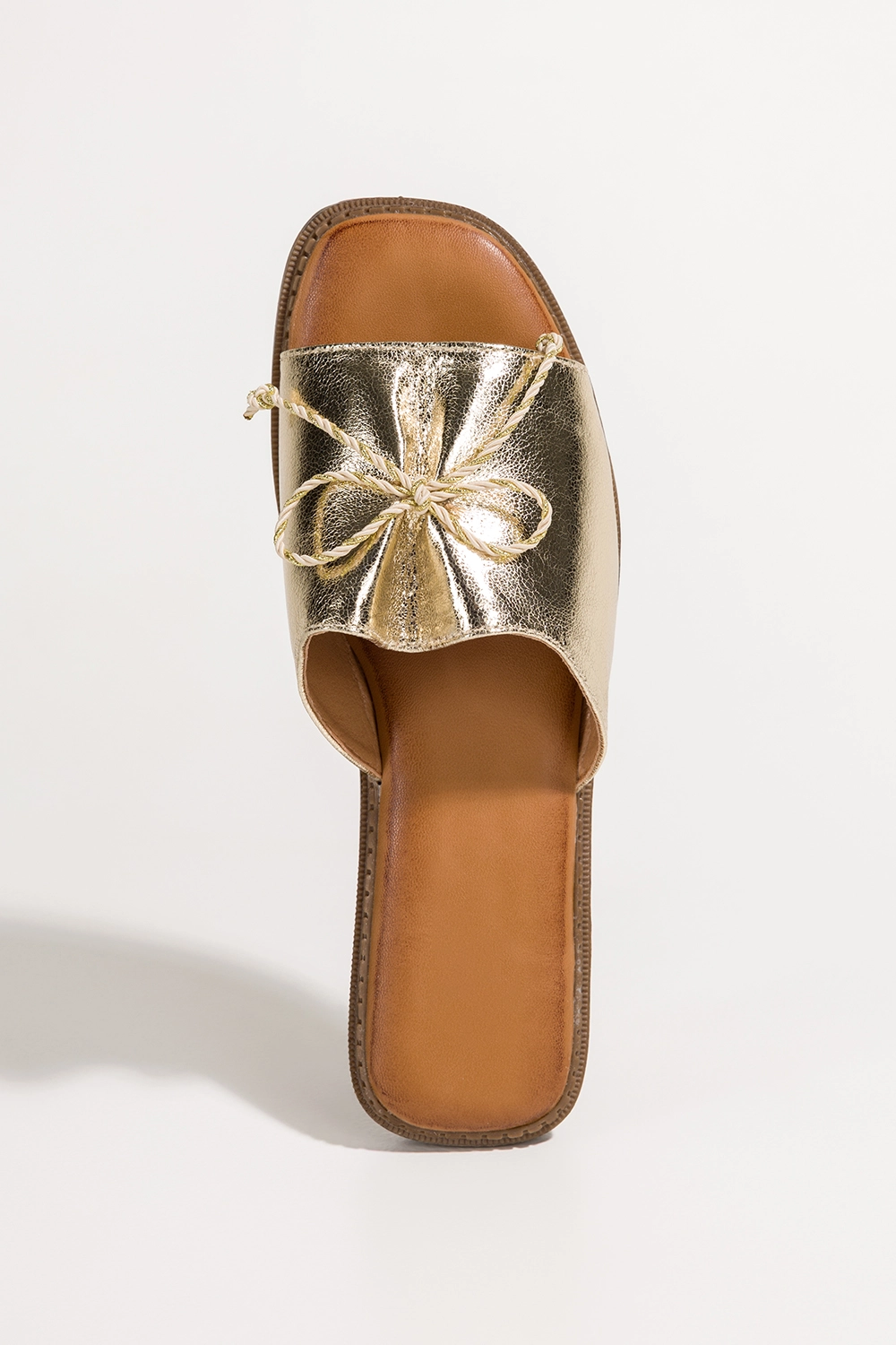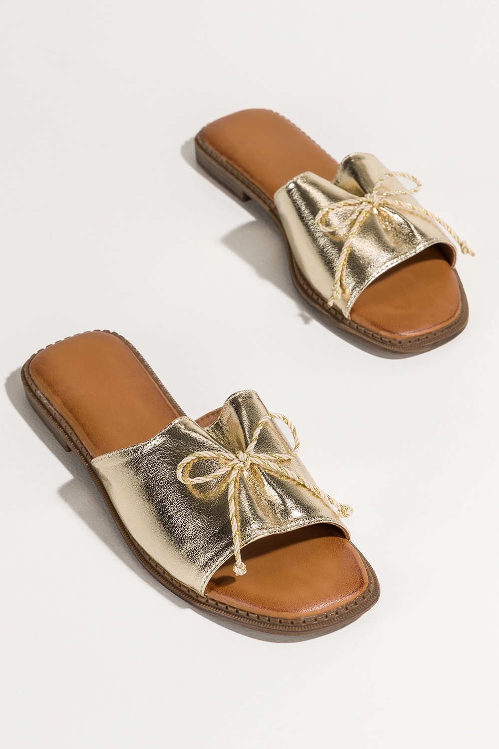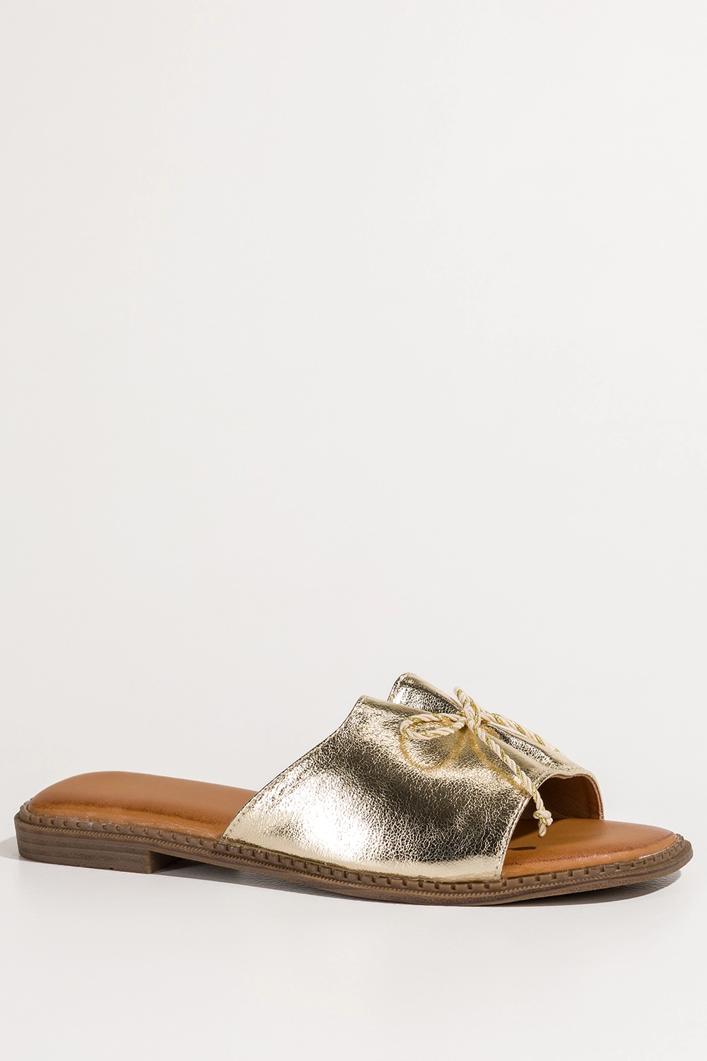 Złote klapki damskie płaskie z ozdobną kokardą Carla model M509P to prawdziwa perełka letniej garderoby, łącząca efektowny wygląd, wysoką jakość wykonania i niezrównaną wygodę. Zaprojektowane z myślą o kobietach, które pragną wyglądać stylowo i czuć się komfortowo przez cały dzień, te klapki przyciągają wzrok subtelnym połyskiem i starannym wykończeniem. Wykonane z błyszczącej, złotej skóry ekologicznej, od pierwszego spojrzenia zachwycają elegancją i lekkością. Miękka wkładka ze skóry ekologicznej delikatnie otula stopę, zapewniając komfort nawet podczas długich spacerów. Wsuwana konstrukcja sprawia, że obuwie idealnie sprawdzi się na szybkie wyjścia, letnie spacery czy urlopowe wędrówki po promenadzie.